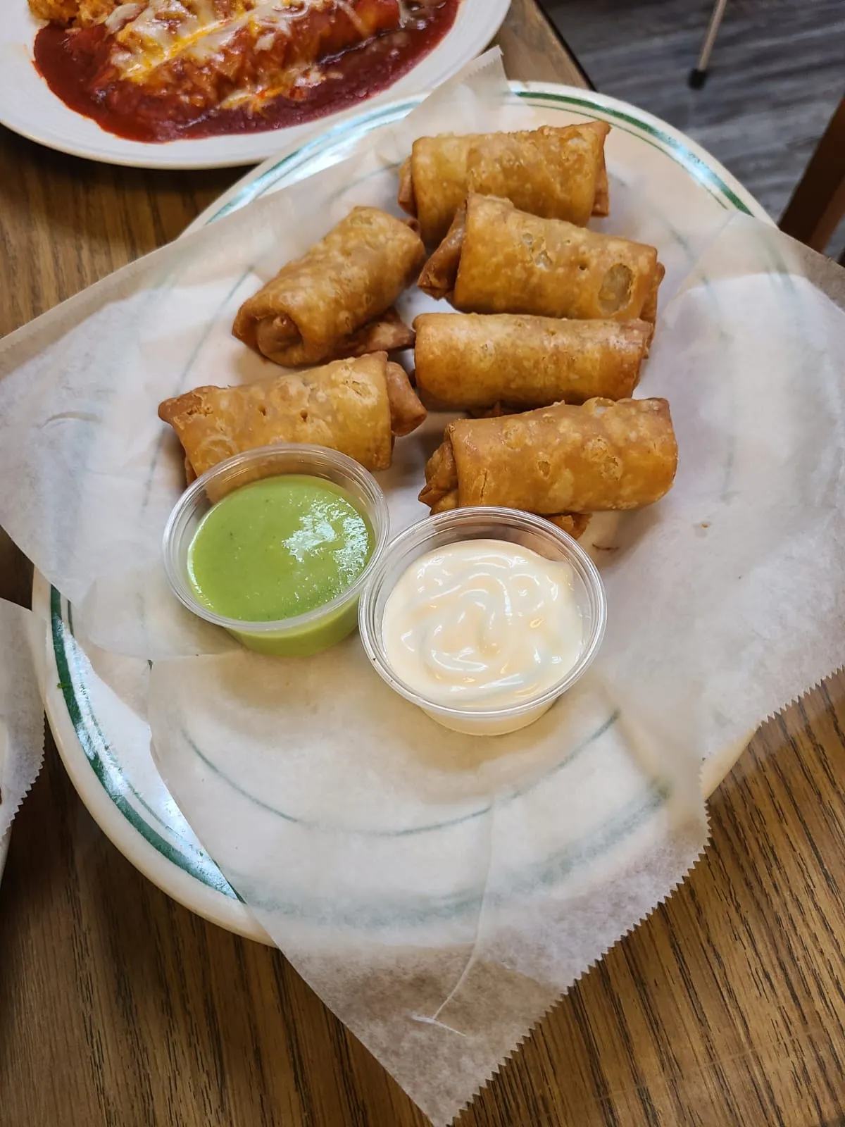 Shredded Chicken, Wrapped In A Flour Tortilla And Deep-Fried, Typically Includes Cheese, Guacamole, Sour Cream, And Pico De Gallo.