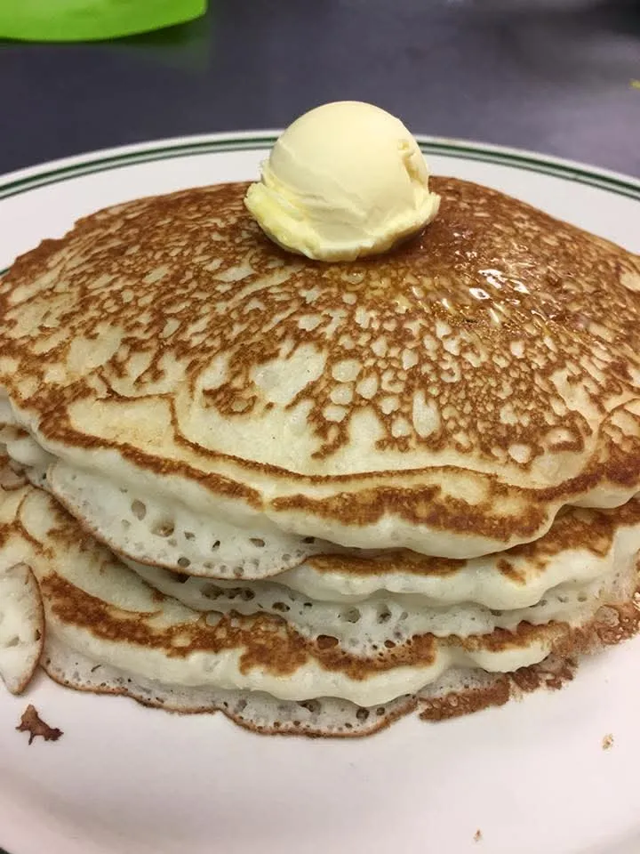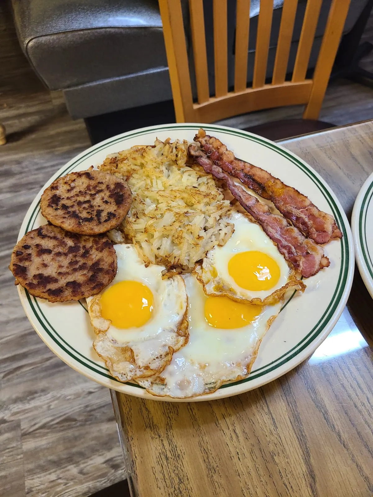 (3) Three Eggs, (2) Sausage Patties, (3) Bacon Strips, (3 ) Buttermilk Pancakes, & Hash Browns Or Country Potatoes.