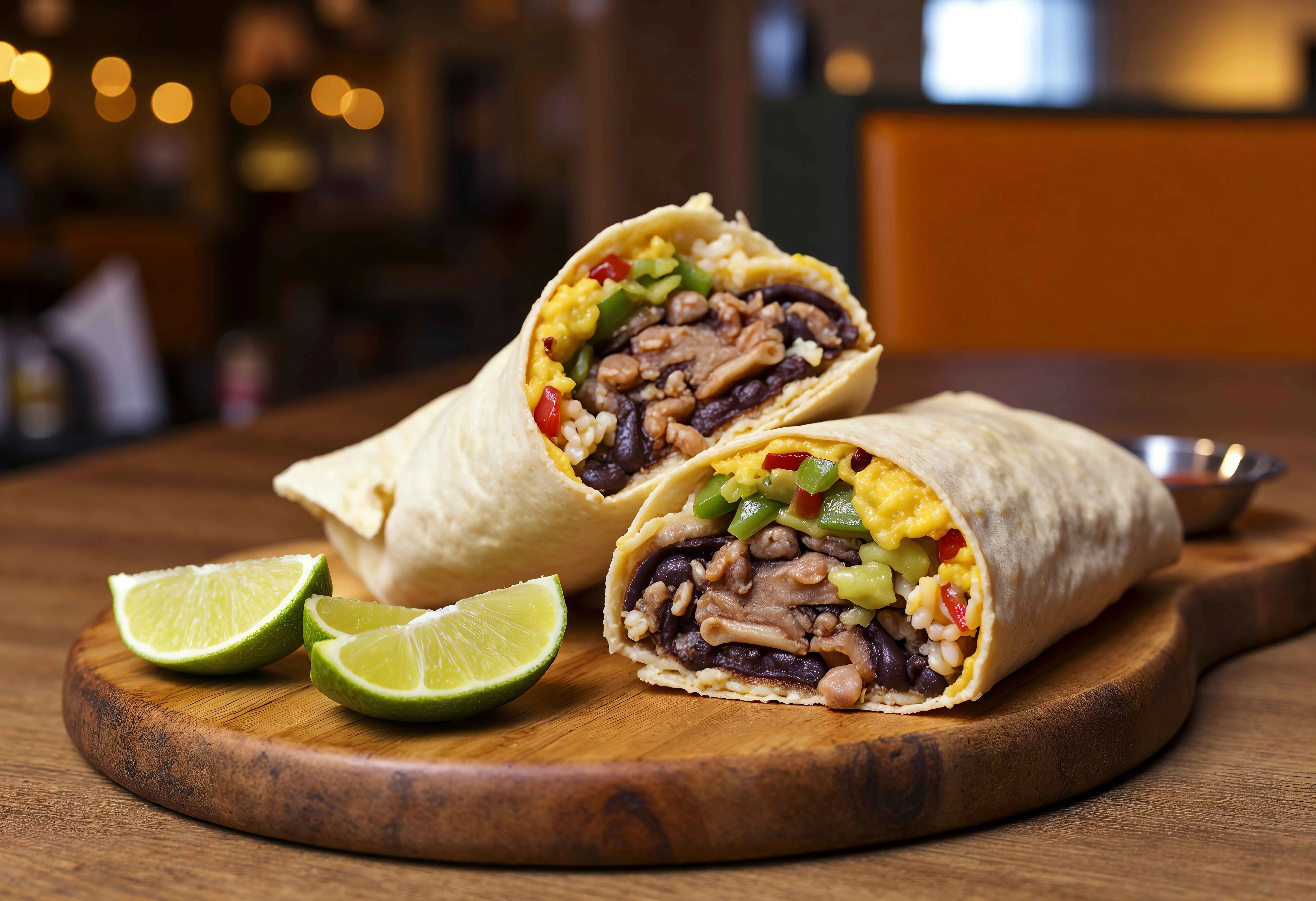 Ham And Eggs Wrapped In A Flour Tortilla, Often Accompanied By Potatoes, Beans, And Cheese.